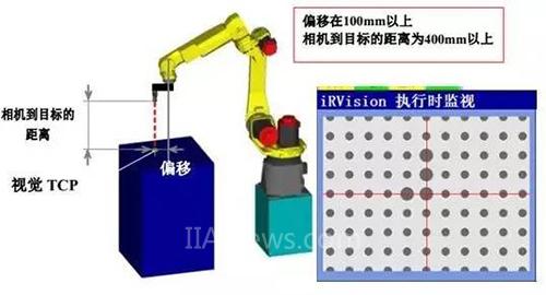 视觉零点标定(Vision Mastering)功能,将相机安装在机器人的工具尖端(无需精度),在多个机器人姿势下,自动测量已被固定的同一测量目标,调整J2~J5轴的零点标定参数和J2~J6轴的弹性系数。