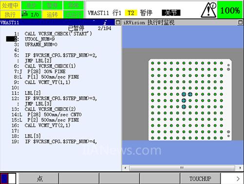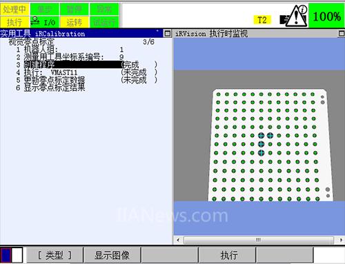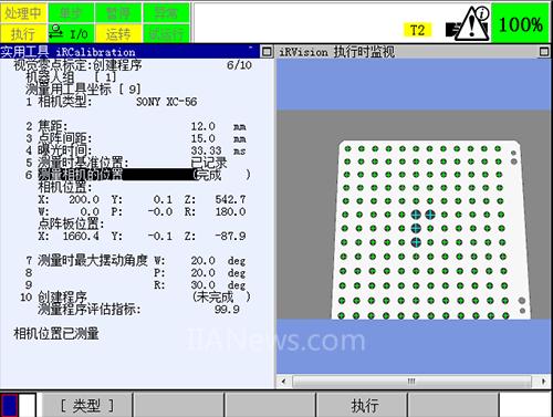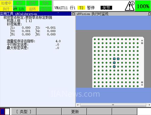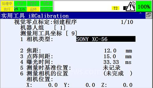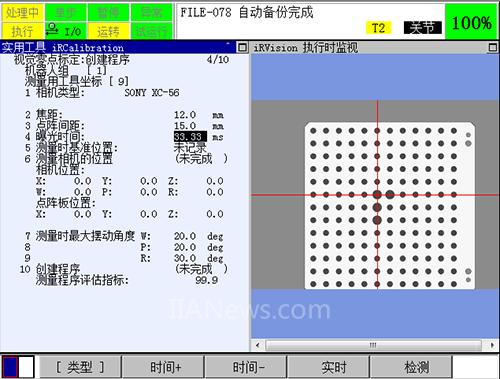 将光标停在第四项,按下ENTER,进入显示测量程序的编辑画面。运行程序,运行过程中倍率要低于30%,初次运行该程序的时候必须要将倍率设置较低,以防止机器人上安装的工具或者相机和机器人本体相撞,若在程序运行中途停止,可以继续执行;若是中途出现了机器人在某个点位无法运动到,在保证点阵板在机器人的视野中,重新示教机器人程序中该点的点位,然后继续执行。