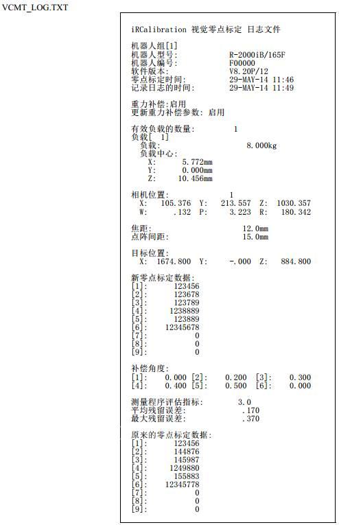 执行零点标定会自动生成零点标定结果的日志文件,在机器人目录\Robot_1\MC下,,该文件可用记事本打开,打开后内容如下截图。
