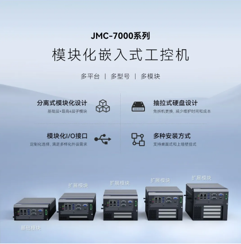 智微工业最新推出的JMC-7000系列模块化嵌入式工控机,支持客户根据需求选择适配扩展板卡和I/O模块做灵活扩展,以满足不同工业应用场景的多样化需求。