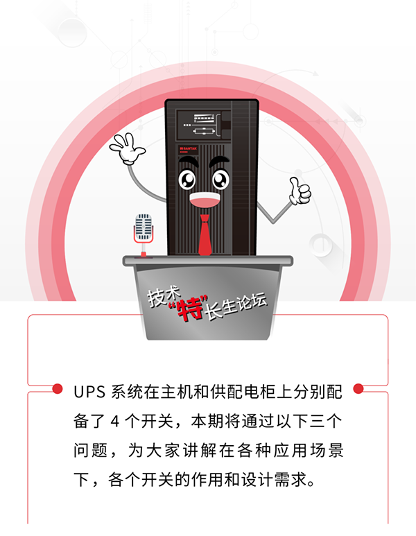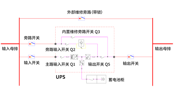 UPS 的内置开关主要是起到 UPS 和输入输出端的通断隔离作用,一般设计为隔离开关,不具备过流保护和带负荷断开的功能,主要是在 UPS 调试或者维护时应用。